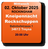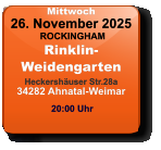 Samstag 14. März 2026 ROCKINGHAMGoethesPostamDGoethestr 29-3134119 Kassel  20:00 Uhr Sonntag 19. April 2026 ROCKINGHAMKeller Z87Frankfurter Str. 8797082 Würzburg  20:00 Uhr TicketsOnline